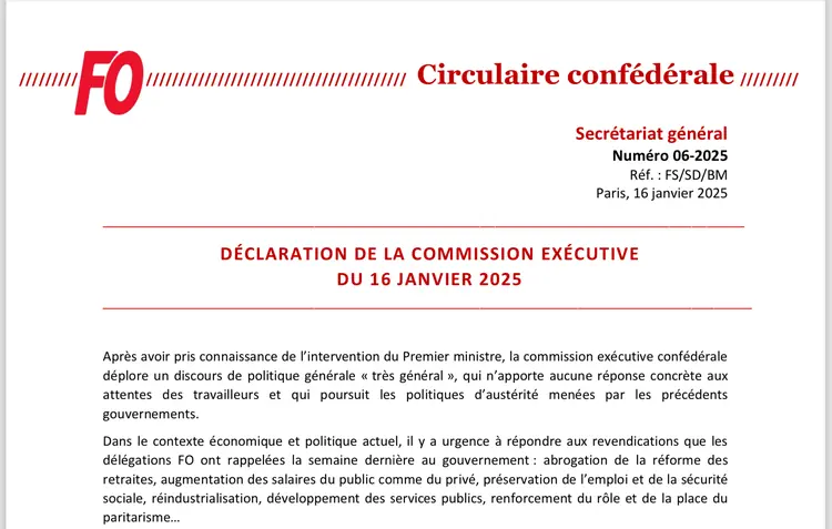 Après avoir pris connaissance de l’intervention du Premier ministre, la commission exécutive confédérale déplore un discours de politique générale « très général », qui n’apporte aucune réponse concrète aux attentes des travailleurs et qui poursuit les politiques d’austérité menées par les précédents gouvernements.