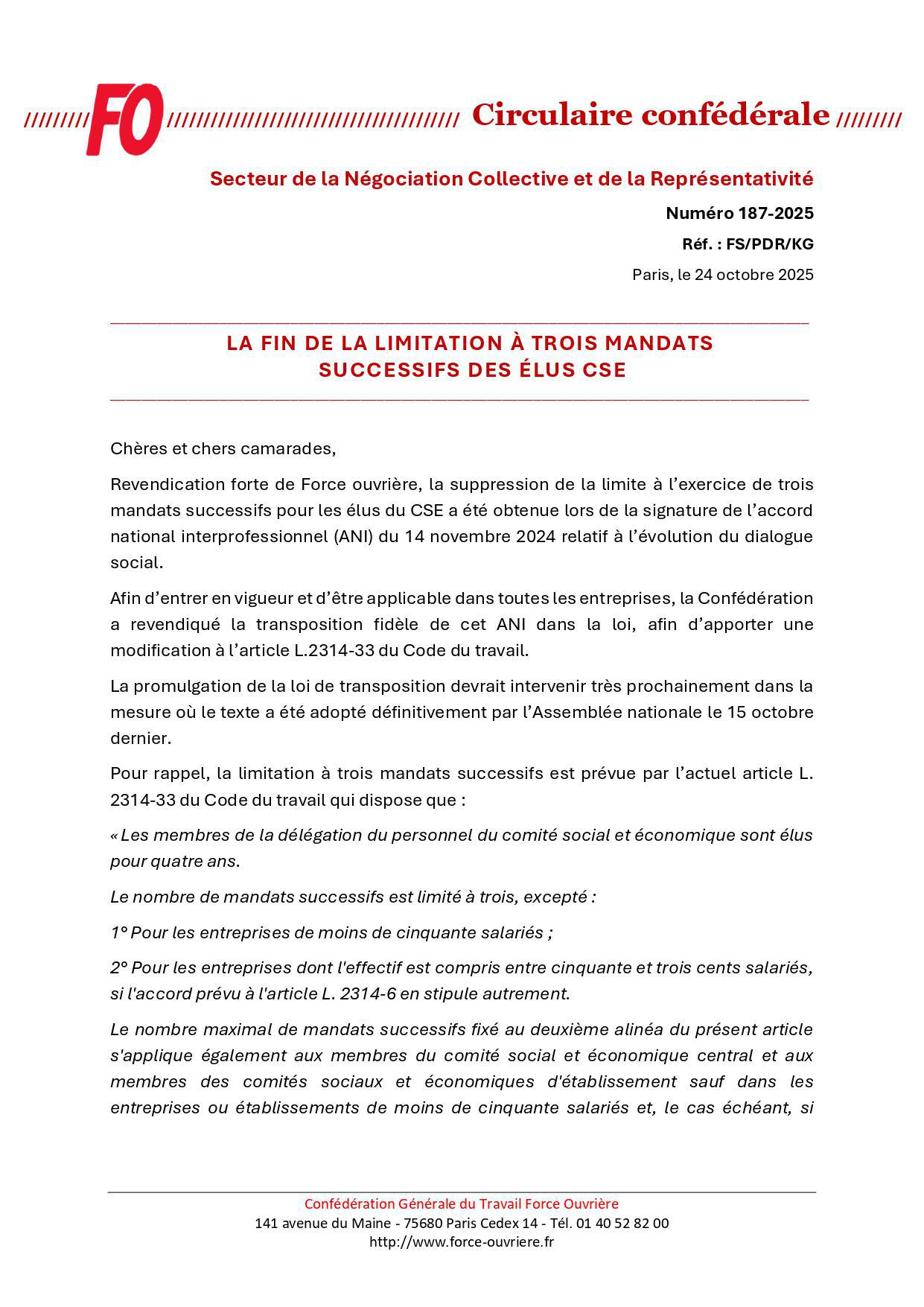 Circ. n° 187-2025 - La fin de la limitation à trois mandats successifs des élus CSE Circ. n° 187-2025 - La fin de la limitation à trois mandats successifs des élus CSE